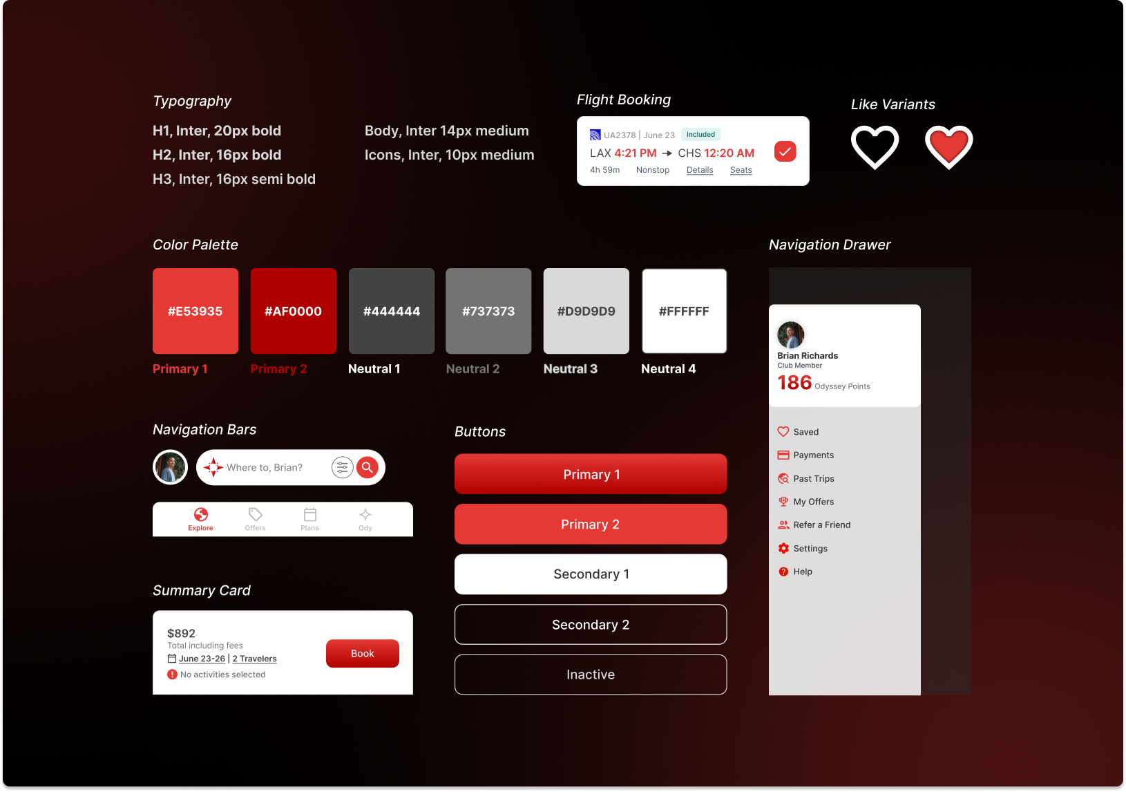 To support American Odyssey’s brand vision, I developed a unified component library that translates the identity into a flexible, scalable UI system. The goal was to create an interface that feels confident, warm, and intuitive while maintaining the clarity travelers need as they plan their journeys.