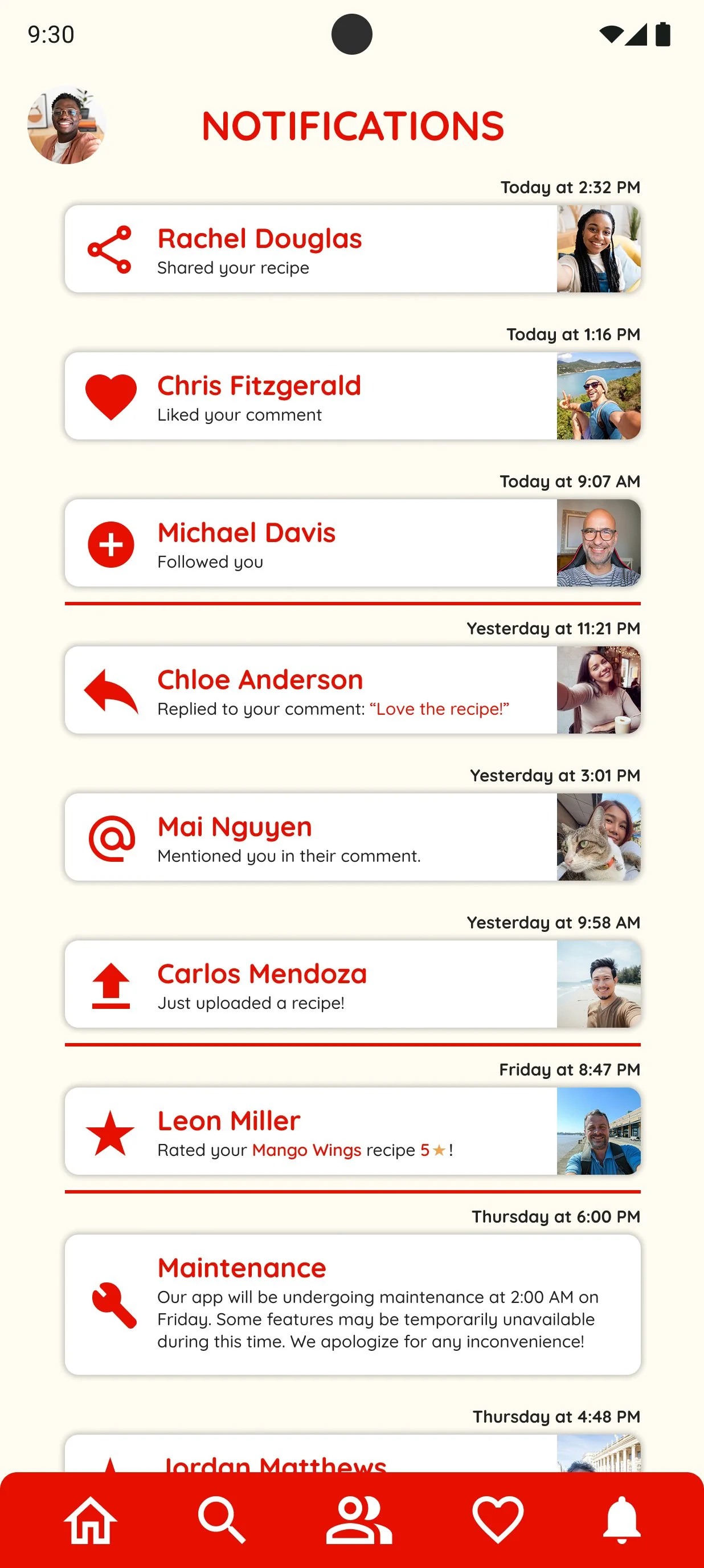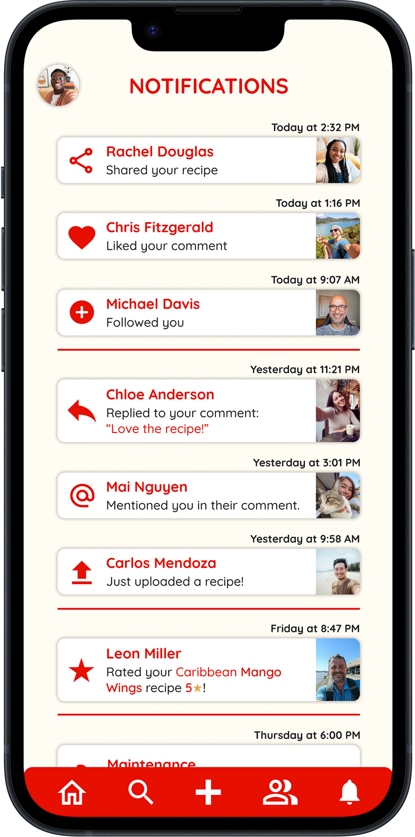 Staying connected should feel effortless. I designed the notifications page to keep users updated when friends share recipes, new followers join, or someone interacts with their post. It keeps FlavorSync feeling active, personal, and community-driven.