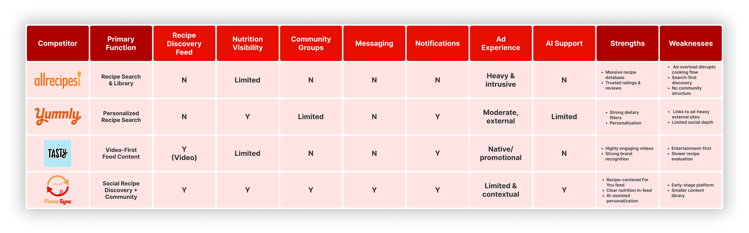 Each platform offers valuable pieces of the cooking journey such as large recipe libraries, personalization, or highly engaging food content, yet all introduce friction through ad-heavy interfaces, inefficient discovery patterns, or entertainment-first formats that slow real decision-making. None combine a recipe-centered discovery feed, meaningful community spaces, and AI-supported personalization in a way that feels seamless and respectful of users’ attention. These gaps in clarity, connection, and usability directly shaped FlavorSync’s direction as a more thoughtful, social cooking experience built to support confidence in the kitchen.