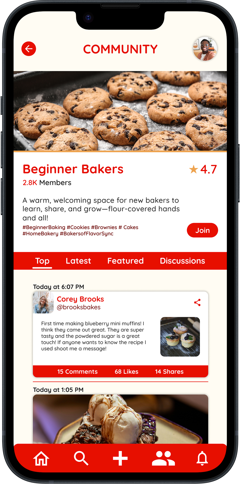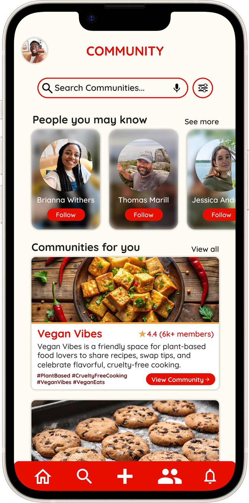 I designed the community page to make recipe discovery social and personal. Users can share their creations, follow others with similar tastes, and find inspiration through real connections—not just algorithms.