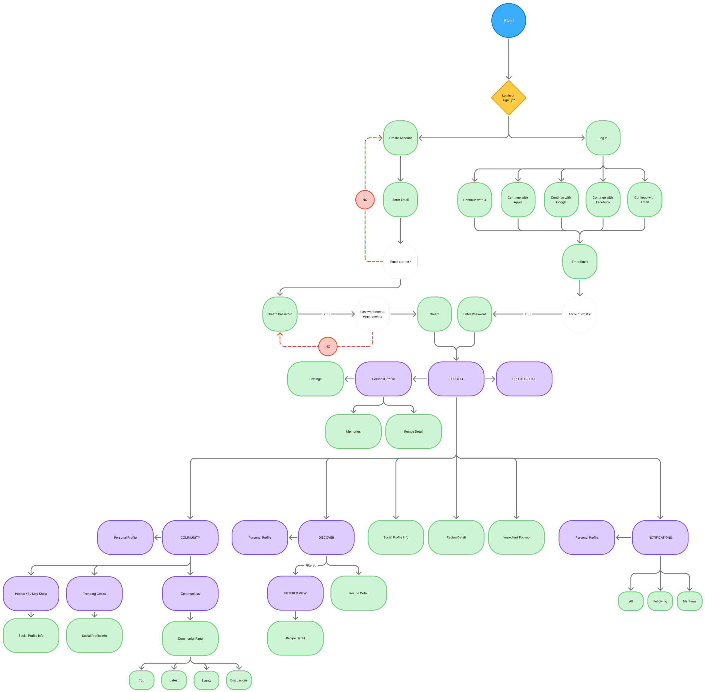 After reviewing the research and identifying where users were getting slowed down, I focused on creating an information architecture that removed friction and made the experience easier to navigate. The user flow centers around a recipe-first “For You” feed, allowing users to discover, evaluate, and move forward quickly without unnecessary steps. This structure set the foundation for a faster, more intuitive cooking experience.