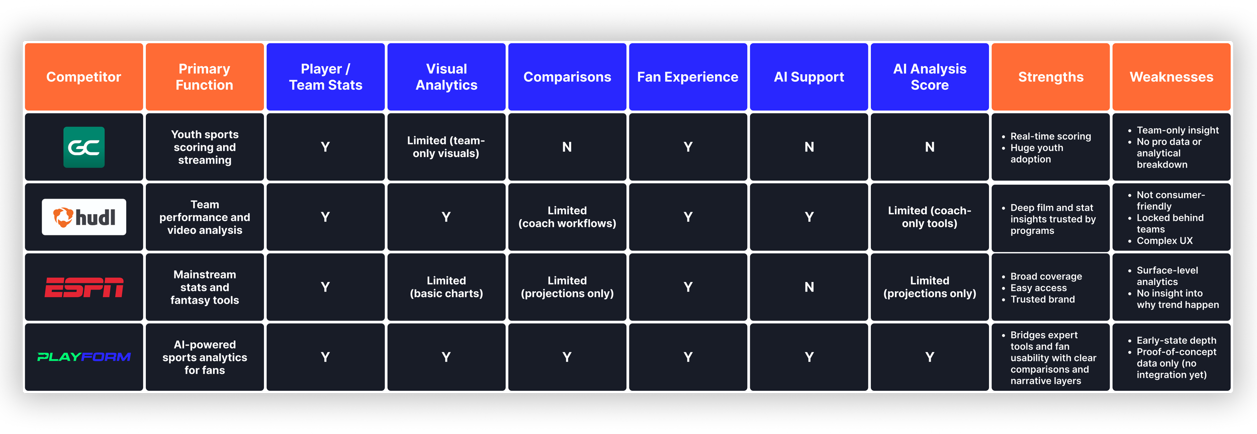 GameChanger, Hudl, and ESPN each solve pieces of the sports insight puzzle. GameChanger brings real-time information to families, Hudl serves teams with deep tools, and ESPN delivers broad coverage to casual fans. However, none give everyday fans a clear way to understand performance or compare players fairly. Insight is either too shallow, too technical, or locked behind team access. None offer narrative context, AI support, or comparison modes built for fans. These gaps shaped Playform as a more approachable way to understand players, trends, and matchups at a glance.